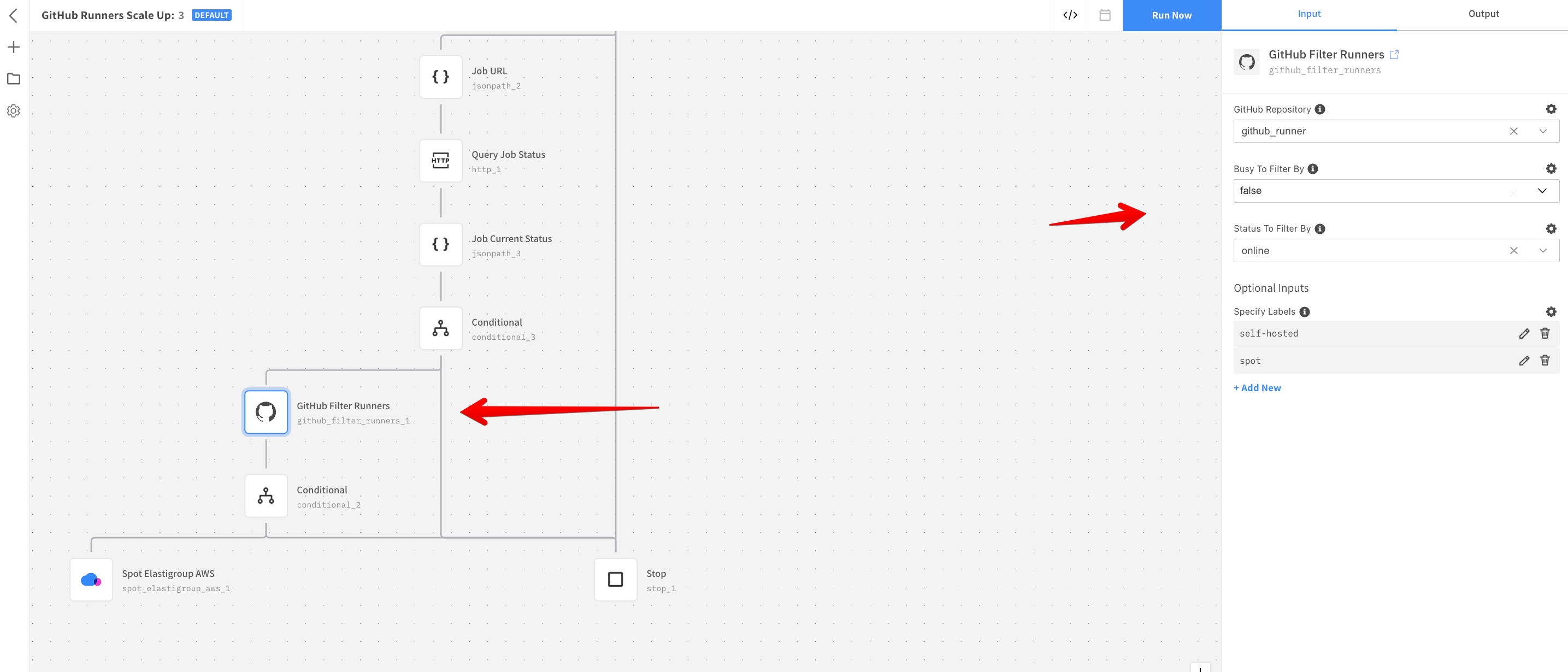 falseand the Status filter is set asonline. - Match the Specify labels in the GitHub Filter Runners with the workflow jobs and the user data. In this guide, the Workflow Jobs use the custom spot label and the inbuilt