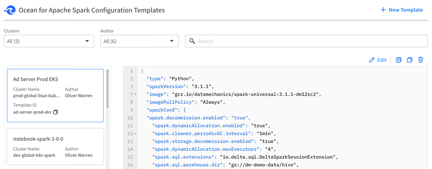 Configuration templates are fragments of Spark application configuration stored in Ocean Spark. This is useful when you need to share a large default configuration between multiple applications, or to avoid storing configurations on your side.